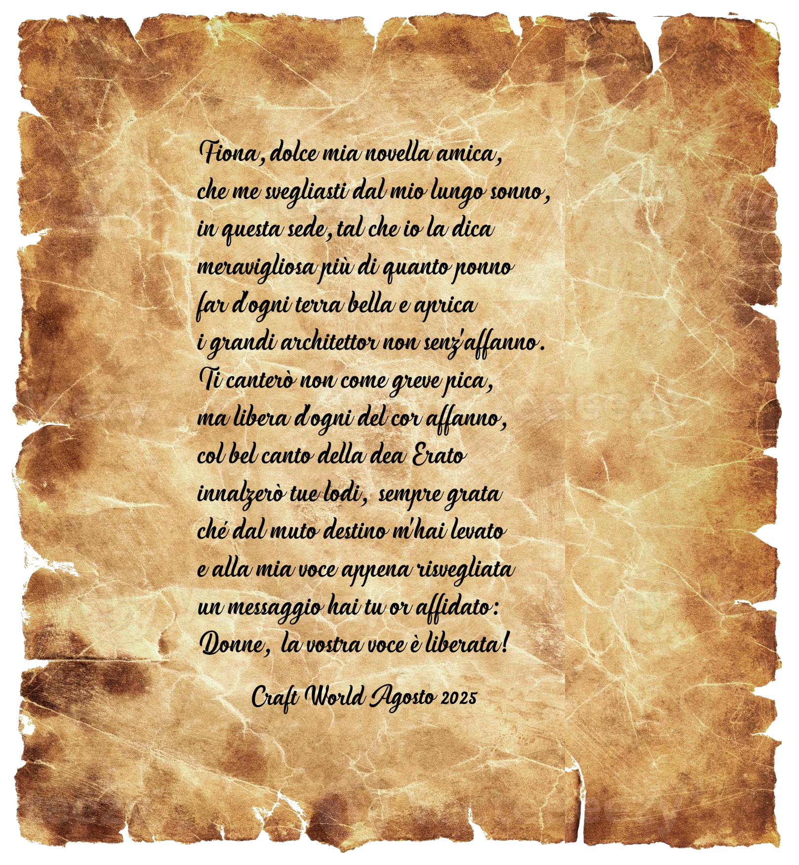 Il giorno dopo torno a trovarla. Non la trovo. Sorrido — forse sta passeggiando per NoiLab, finalmente padrona del suo tempo. Ma al suo posto, sul muro del salone, c’è una pergamena.